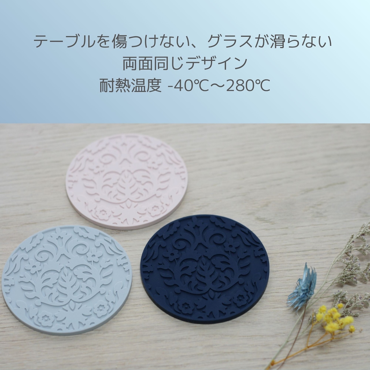 アンティーク風のダマスク模様をあしらった、北欧ナチュラルな雰囲気のシリコンコースター3枚セットです。